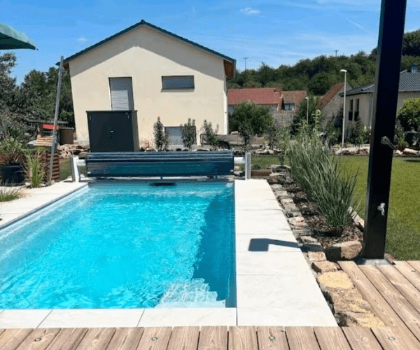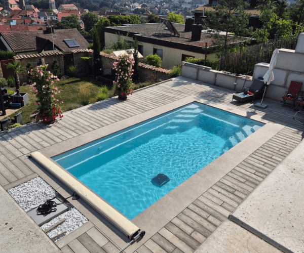 Da es sich um vorgefertigte Fertigbecken handelt, kann der Einbau oft innerhalb weniger Tage erfolgen. Der Gesamtzeitrahmen hängt vom Aushub, der Technik und der Außenanlage ab.